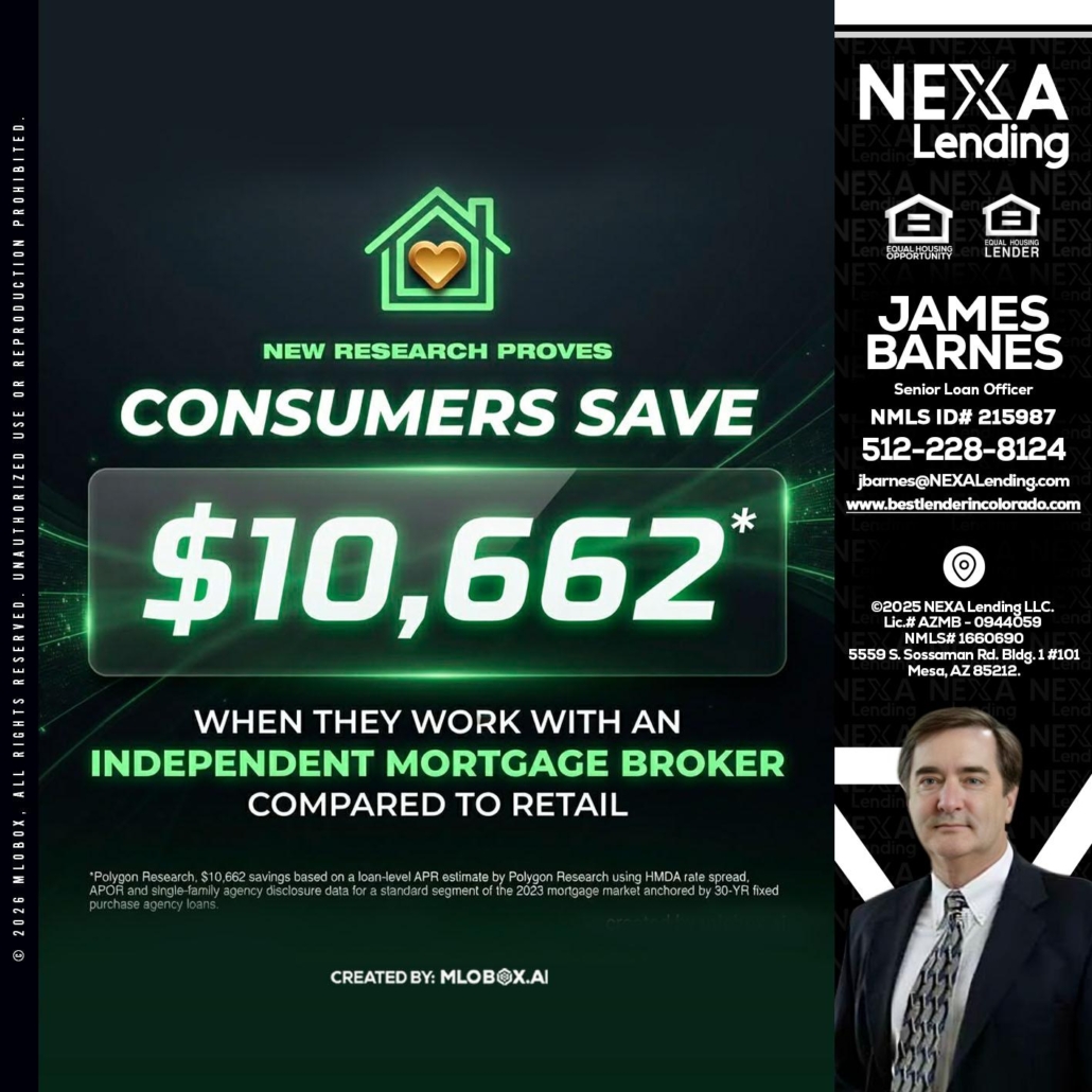 Hi, my name is James Barnes. I’m a Loan Officer with NEXA Lending LLC., offering personalized mortgage solutions, fast customized quotes, great rates and service with integrity.