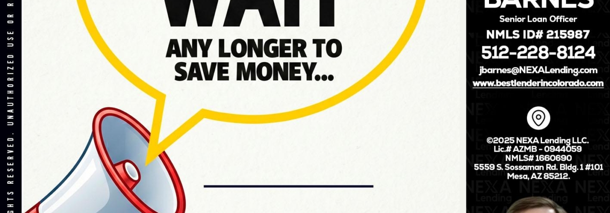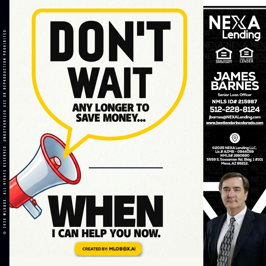 DONT WAIT - James Barnes -Senior Loan OfficerHi, my name is James Barnes. I’m a Loan Officer with NEXA Lending LLC., offering personalized mortgage solutions, fast customized quotes, great rates and service with integrity.