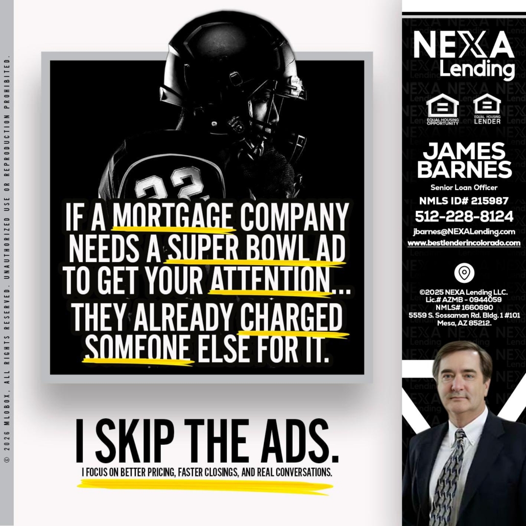 if a mortgage ad - James Barnes -Senior Loan OfficerHi, my name is James Barnes. I’m a Loan Officer with NEXA Lending LLC., offering personalized mortgage solutions, fast customized quotes, great rates and service with integrity.