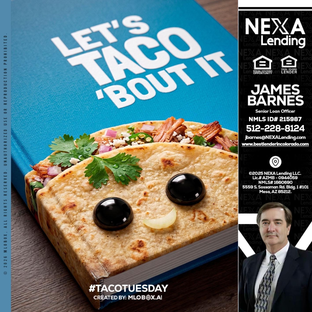 LETS TACO ABOUT IT - James Barnes -Senior Loan OfficerHi, my name is James Barnes. I’m a Loan Officer with NEXA Lending LLC., offering personalized mortgage solutions, fast customized quotes, great rates and service with integrity.