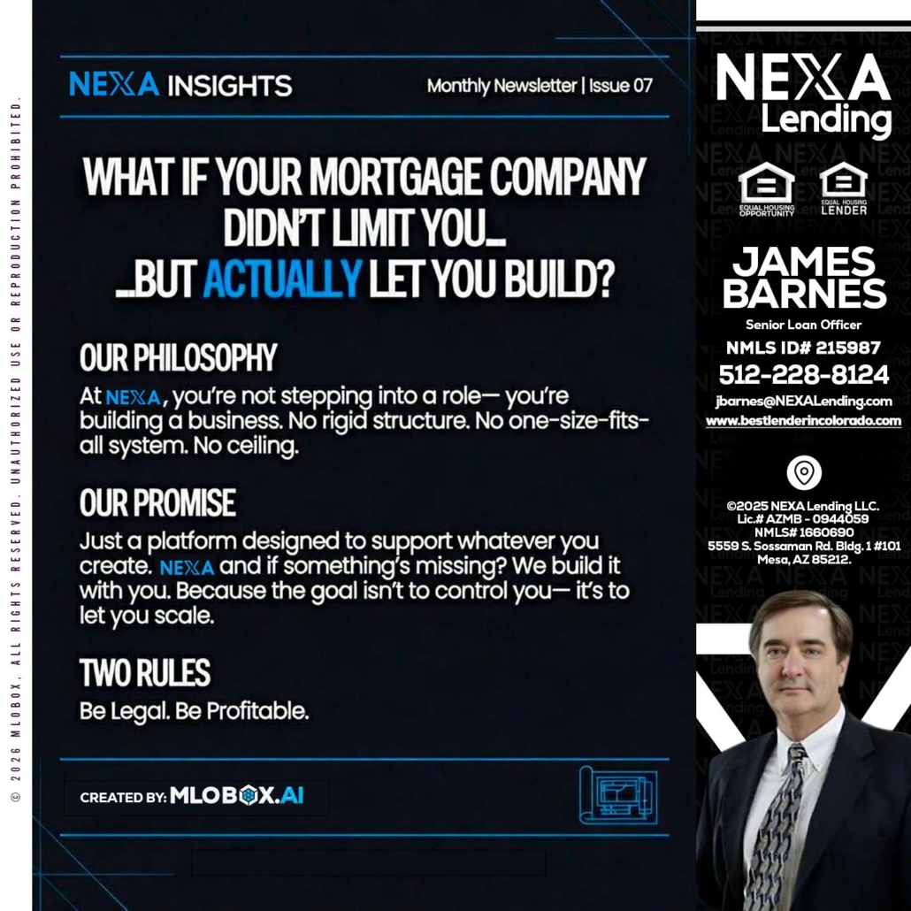 Hi, my name is James Barnes. I’m a Loan Officer with NEXA Lending LLC., offering personalized mortgage solutions, fast customized quotes, great rates and service with integrity.