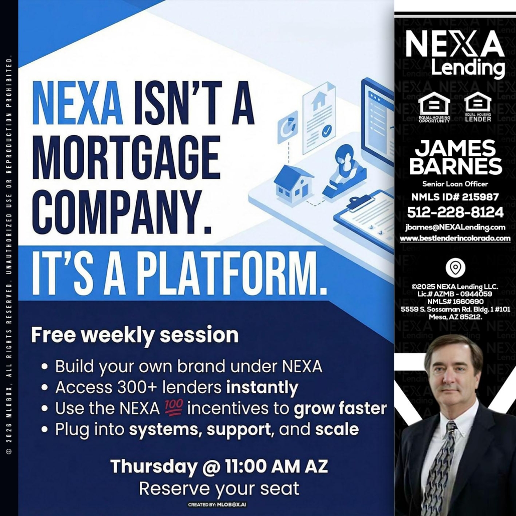 Hi, my name is James Barnes. I’m a Loan Officer with NEXA Lending LLC., offering personalized mortgage solutions, fast customized quotes, great rates and service with integrity.