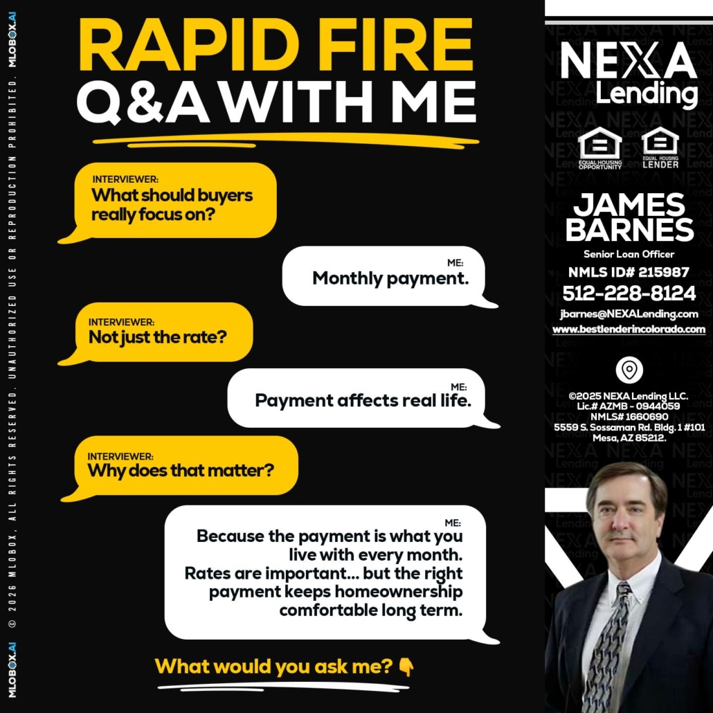 RAPID FIRE Q&A - James Barnes -Senior Loan OfficerHi, my name is James Barnes. I’m a Loan Officer with NEXA Lending LLC., offering personalized mortgage solutions, fast customized quotes, great rates and service with integrity.